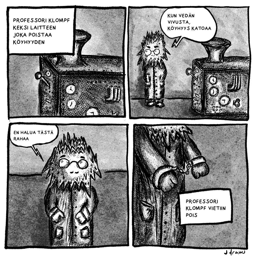 Kuinka omituiselta se tuntui lapsena, kuinka harmittomalta se tuntuu nyt, kun niukkuudesta laitetaan kärsimään eniten ne, joilla ei alunperinkään ollut paljoa, jos mitään. Klompf on ollut aina, Klompf on tuhat muuta, jotka jatkavat siitä, mikä Klompfilta jää kesken. Meitä on aina leegio, joka haluaa kaikille saman, joka näkee ihmiset samanarvoisina ja haluaa kannatella niitä, jotka eivät juuri nyt jaksa pysyä pinnalla itse.